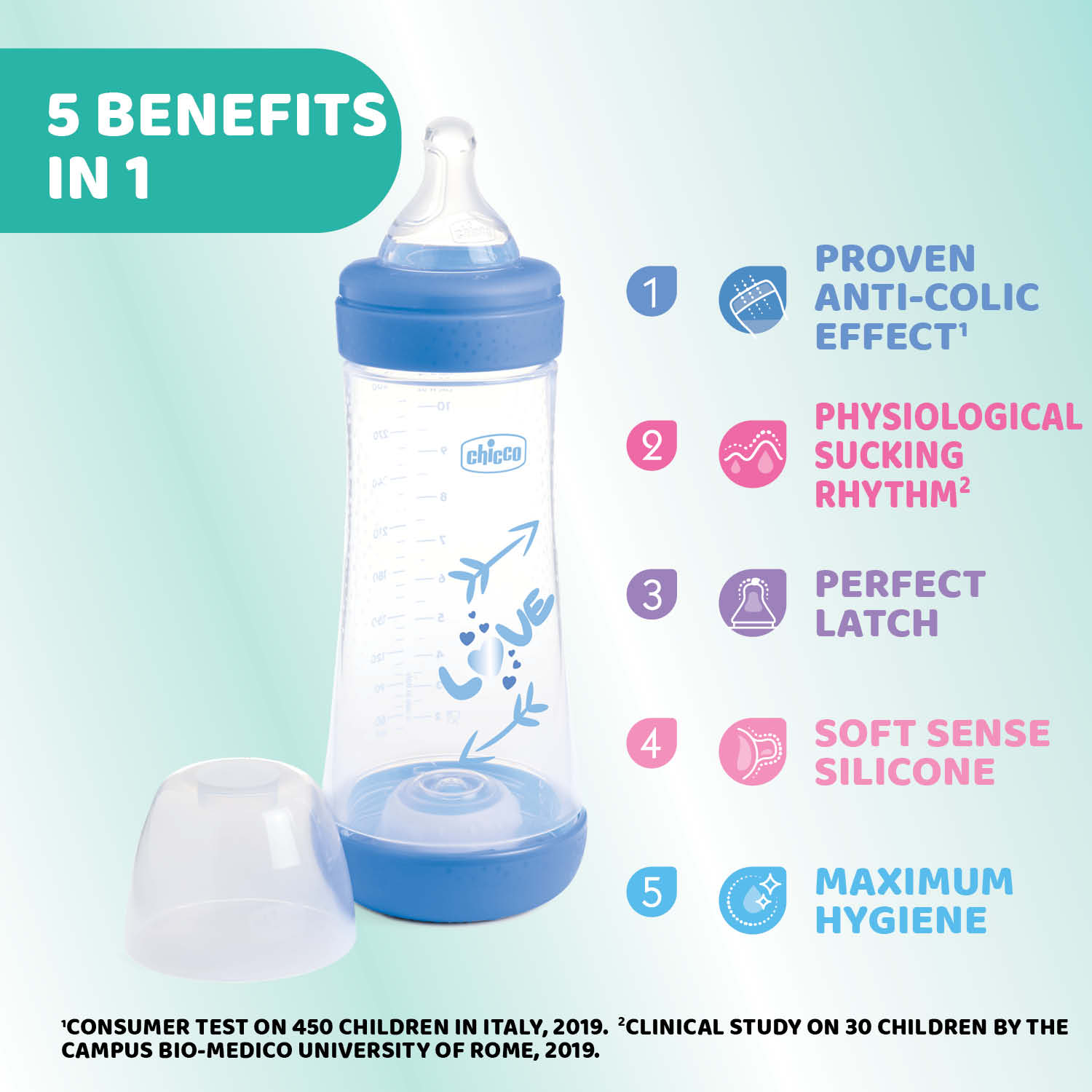 تضمن PERFECT 5 تغذية منتظمة ومريحة وتقلل من حالات الارتجاع والتهيج والمغص وفقًا لـ 96% من الأمهات*. يساعد على تجنب ابتلاع الهواء وفقًا لـ 98% من الأمهات*. *اختبار المستهلك على 450 طفلاً في إيطاليا، 2019.