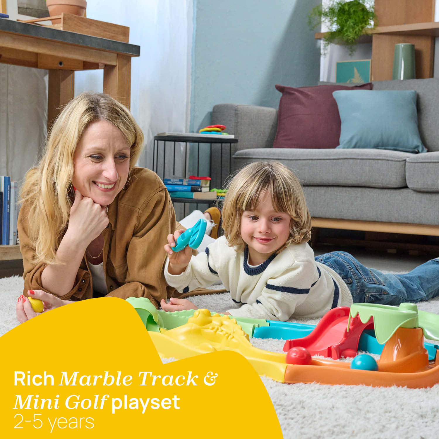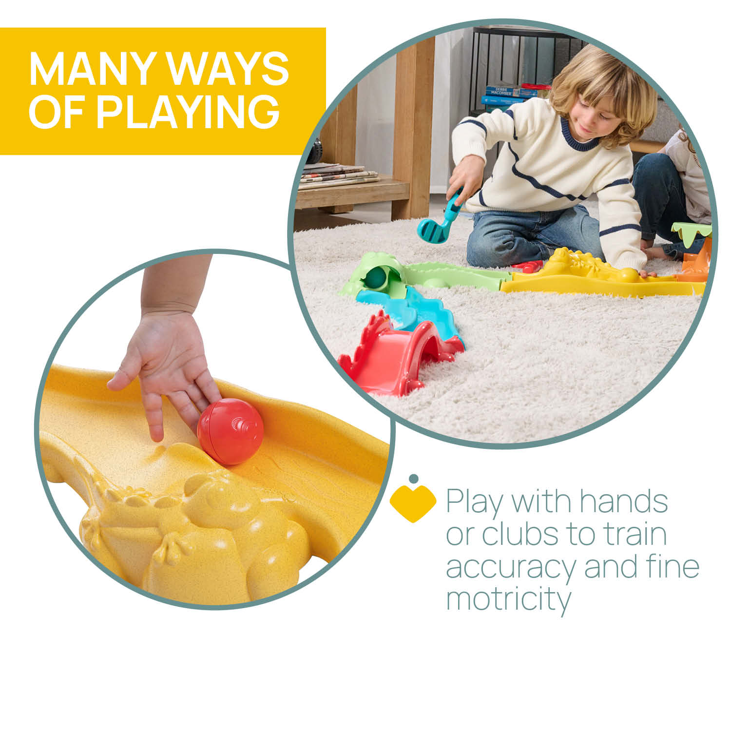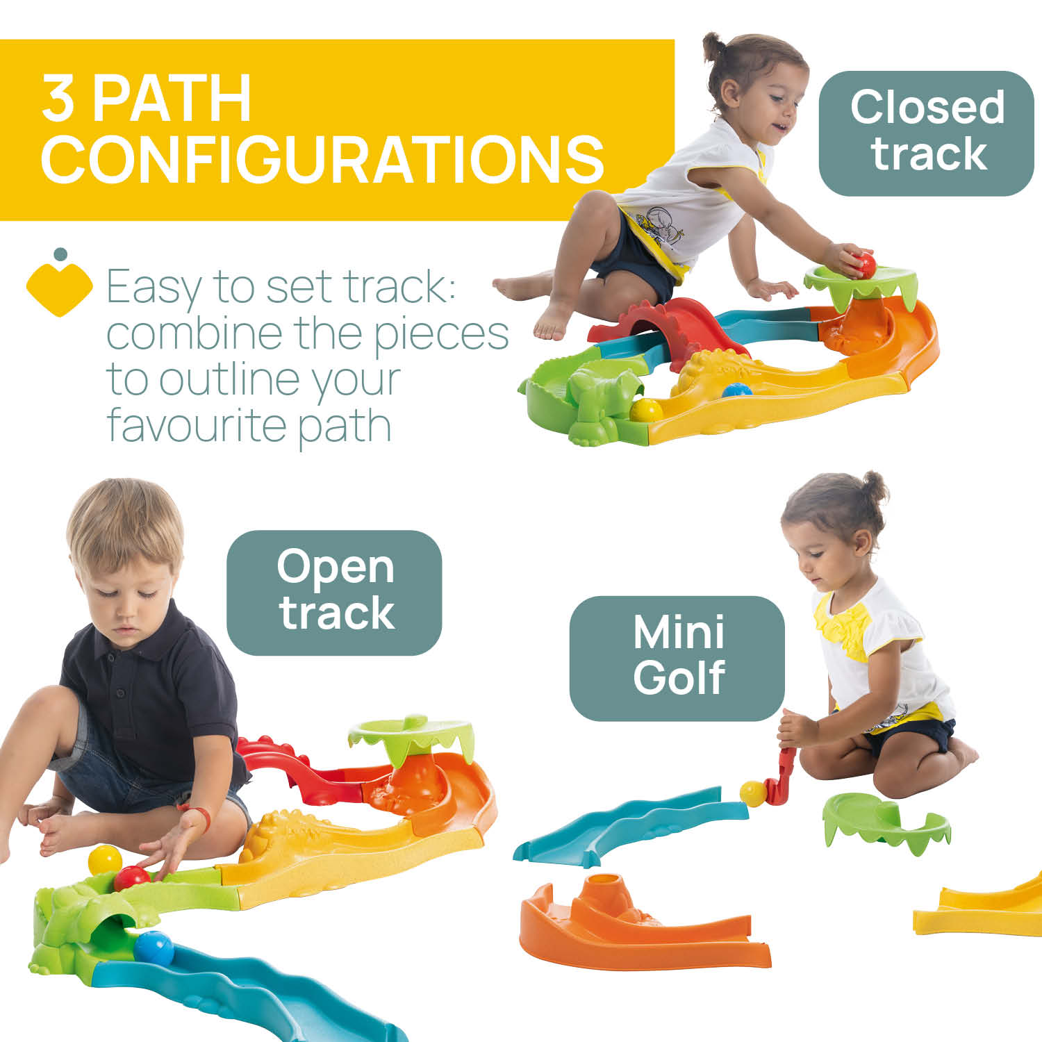 – تكوينات 3 في 1: مضمار مفتوح (حتى 2 متر)، ومضمار مغلق (70 × 52 سم) وغولف صغير