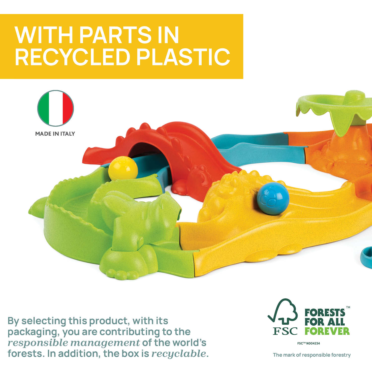 – مكونات المضمار والمضارب مصنوعة من البلاستيك المعاد تدويره بنسبة 80% من المخلفات الصناعية
