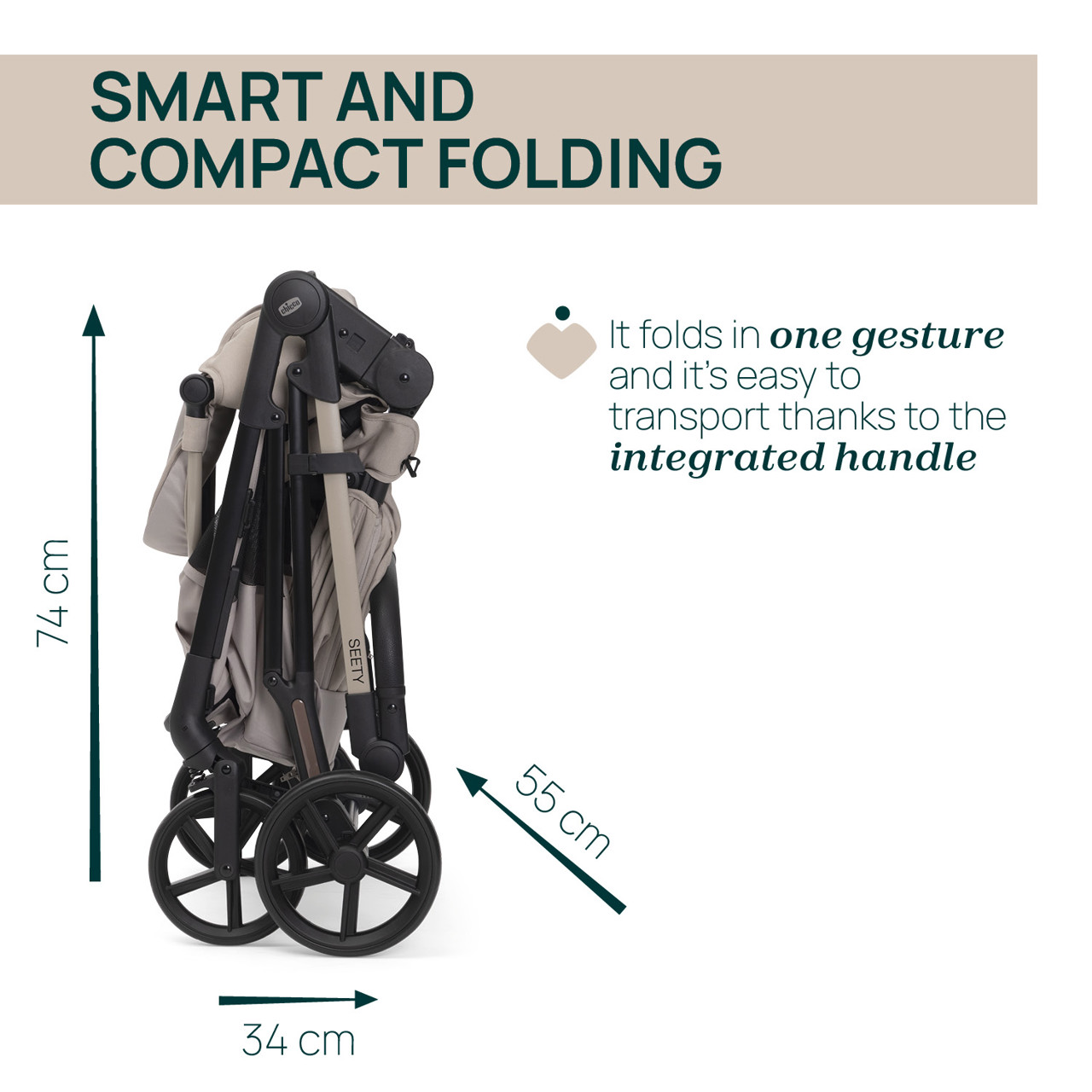 عند التجول في المدينة للحصول على أفضل عملية. الخفة ليست كل شيء، فعربة Seety تتميز بكونها ذكية بشكل لا يصدق. فقد تم التفكير في جميع ميزاتها لمنح الوالدين عربة أطفال عملية ومزودة بجميع وسائل الراحة ويمكن الوصول إليها وسهلة الاستخدام للغاية.