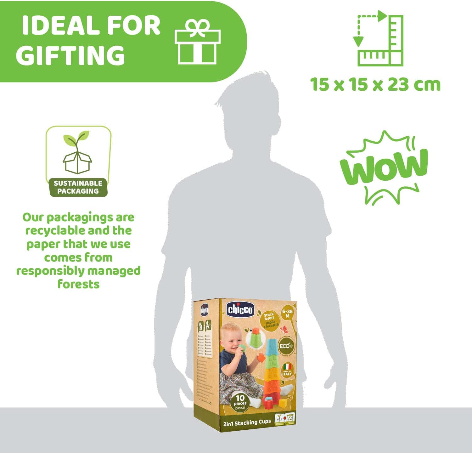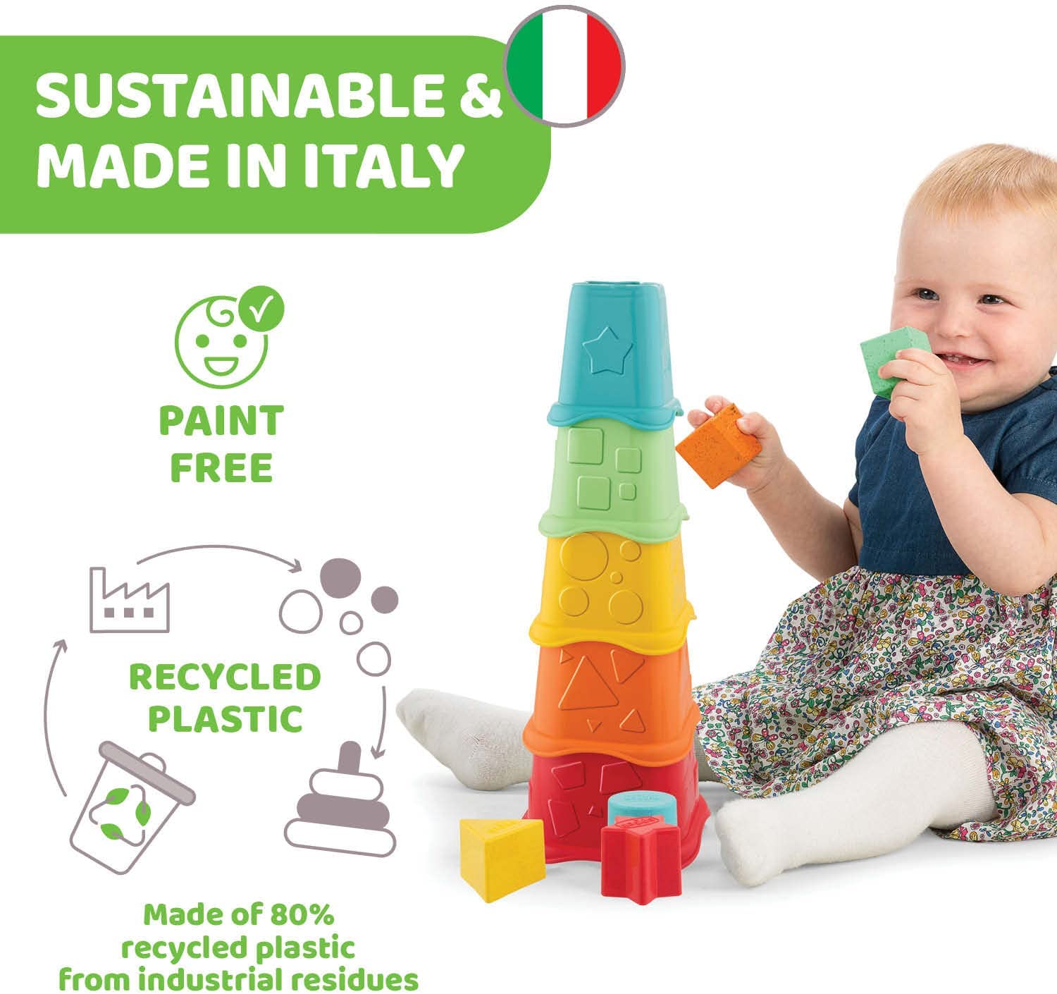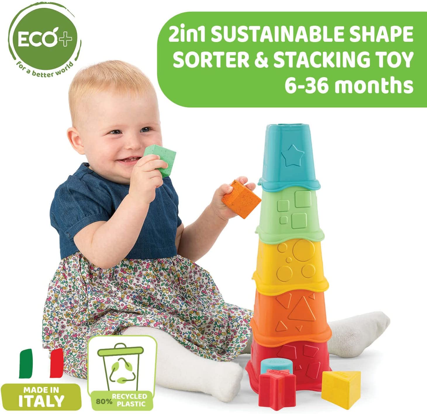 مصنوعة من البلاستيك القابل لإعادة التدوير بنسبة 80% من البلاستيك القابل لإعادة التدوير، أكواب 2in1 القابلة للتكديس هي جزء من مجموعة ألعاب +ECO ECO من شيكو، وهي مجموعة من الألعاب المستدامة المصنوعة في إيطاليا التي تحترم البيئة وتمثل التزامنا بالتصرف بمسؤولية تجاه الأطفال والعالم الذي سينمو فيه من خلال تطوير منتجات تستخدم موارد أحفورية أقل للمساعدة في الحد من التلوث بالنفايات البلاستيكية. تقدم ألعاب ECO +، مثل جميع منتجات Chicco، معايير عالية الجودة والموثوقية والأمان.