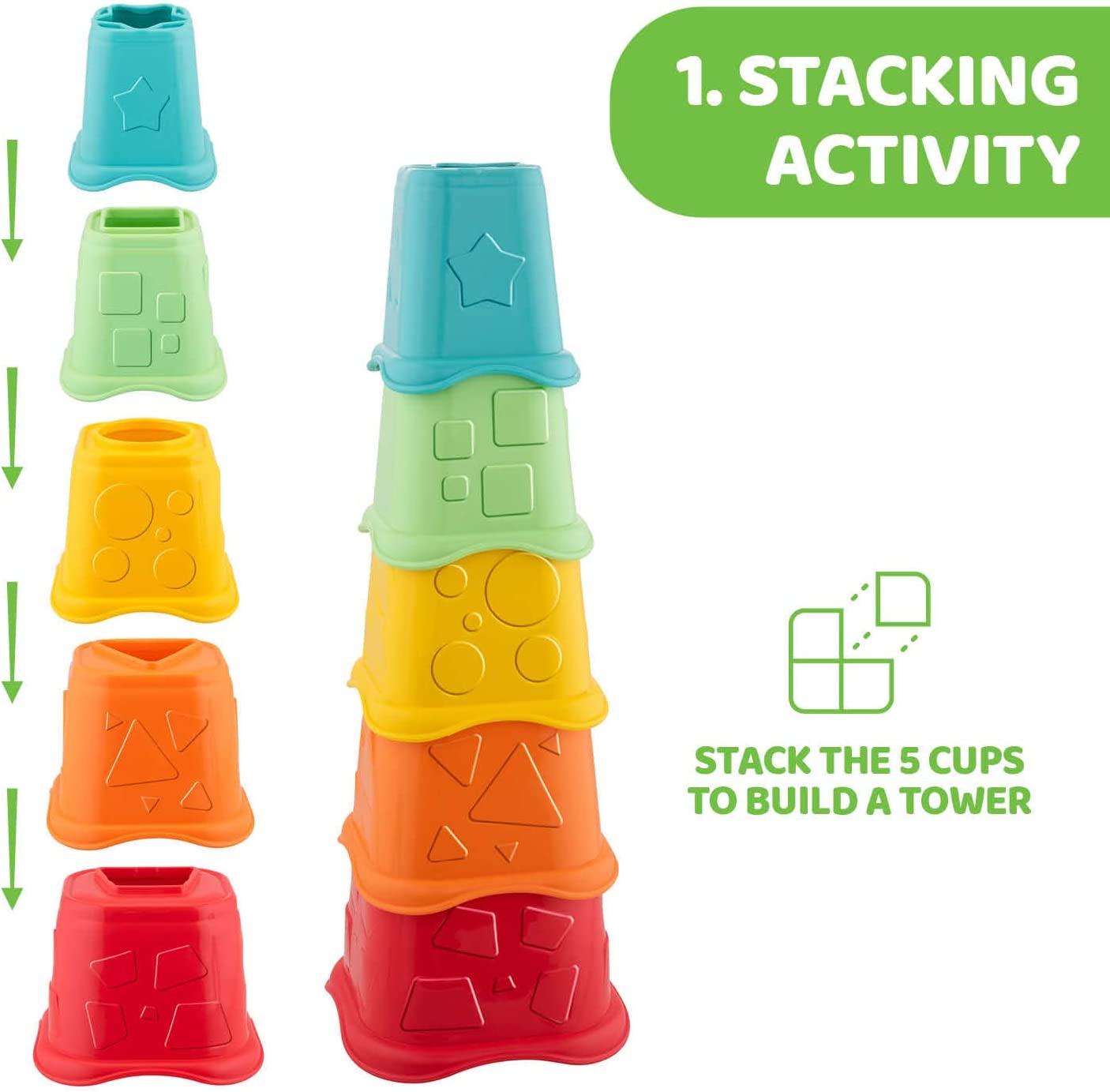 أكواب شيكو 2 في 1 ECO+ من Chicco هي النسخة الذكية من اللعبة الكلاسيكية القابلة للتكديس، والتي تساعد على تطوير قدرة طفلك الإدراكية والتنسيق بين اليد والعين والربط المنطقي. خمسة أكواب متناقصة الحجم يتم تكديسها لبناء برج، وإدخال أكبر عدد ممكن من الأشكال الملونة في الأعلى في الفتحة اليمنى. في نهاية اللعبة، يكفي وضع أكواب 2 في 1 ECO + Chicco واحدة داخل الأخرى، من الأكبر إلى الأصغر، للاحتفاظ بها.