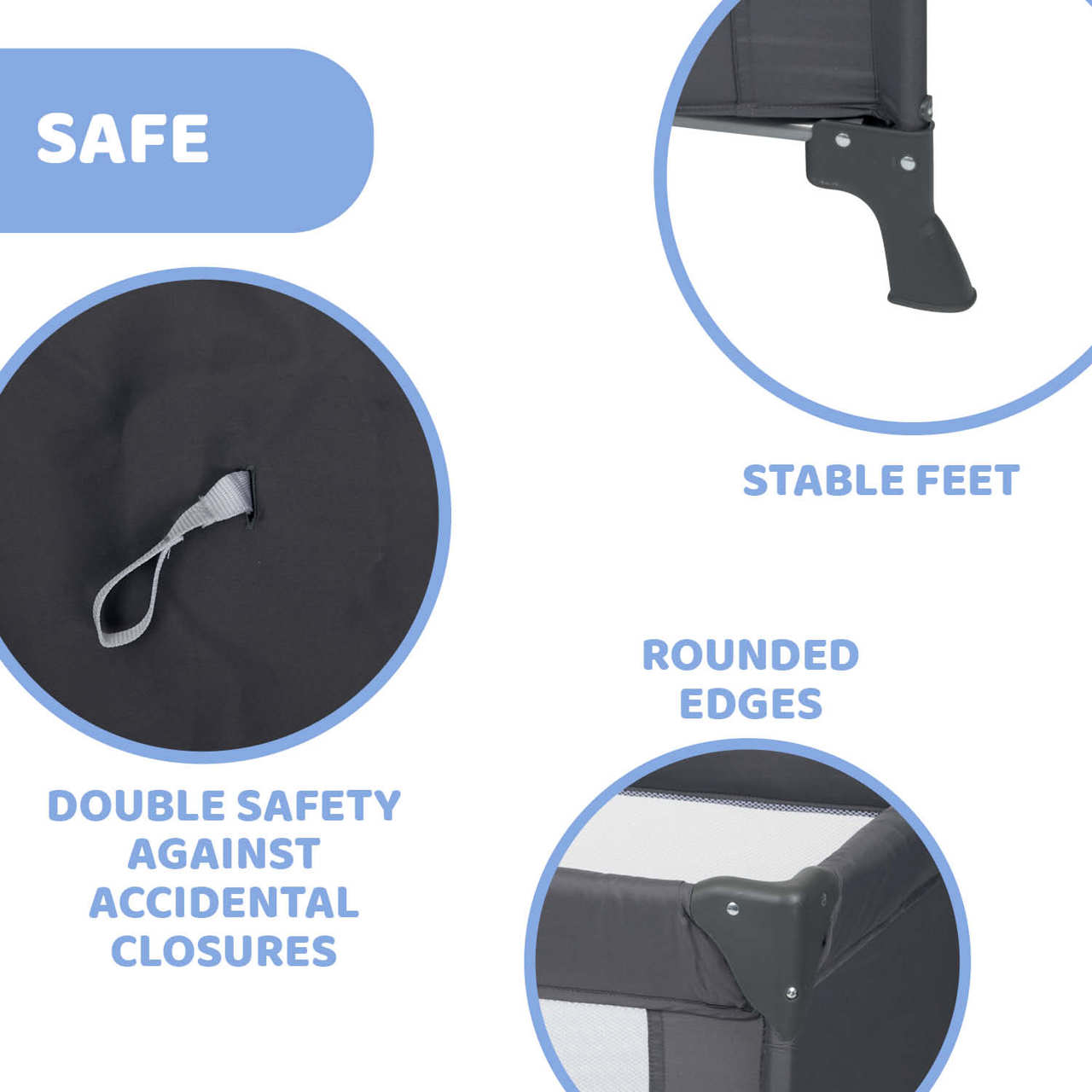 قابل للتنفس: الجانبان الأطول من المهد مزودان بنوافذ كبيرة من الشبك الناعم تضمن تهوية ممتازة وتسمح للوالدين بعدم إغفال الطفل