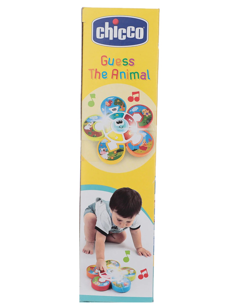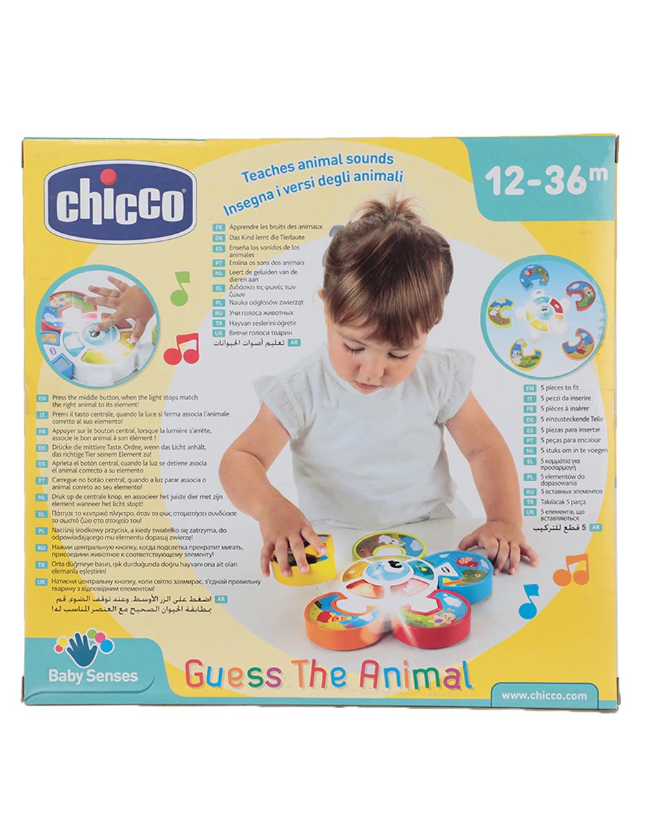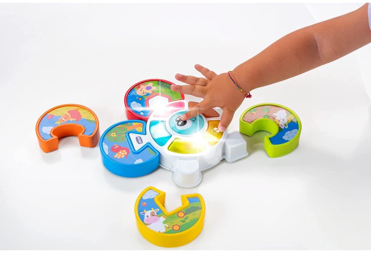 Place the correct puzzle piece in its place and complete the game! Press the funny central face to start playing and to activate the lights’ sequence along with a funny jingle… Once the sequence stops on one light, associate the animal on the puzzle piece to the illuminated element. When the babies insert the correct puzzle piece, that animal’s sound is reproduced and when they complete the entire puzzle, the toy activates lights and funny melodies.