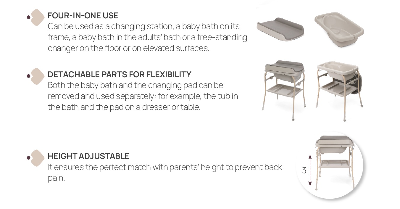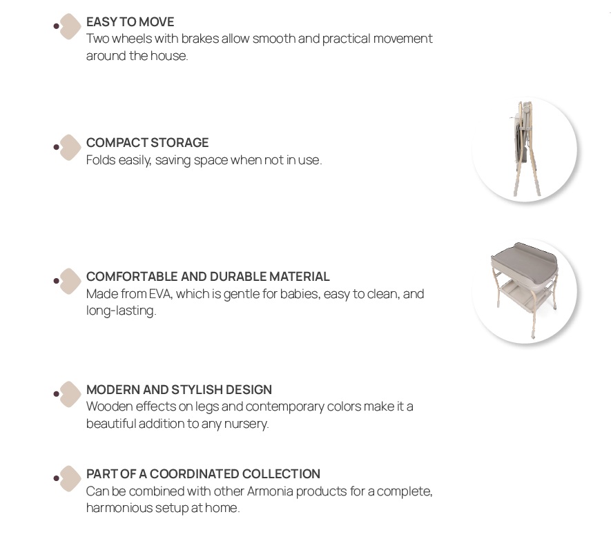 Part of the Armonia collection, Soft Bubble Armonia is a stylish and practical changing unit with a built-in baby bath. With wooden effects on legs and modern colors, it fits perfectly in contemporary homes and can be paired with other Armonia products for a coordinated look.